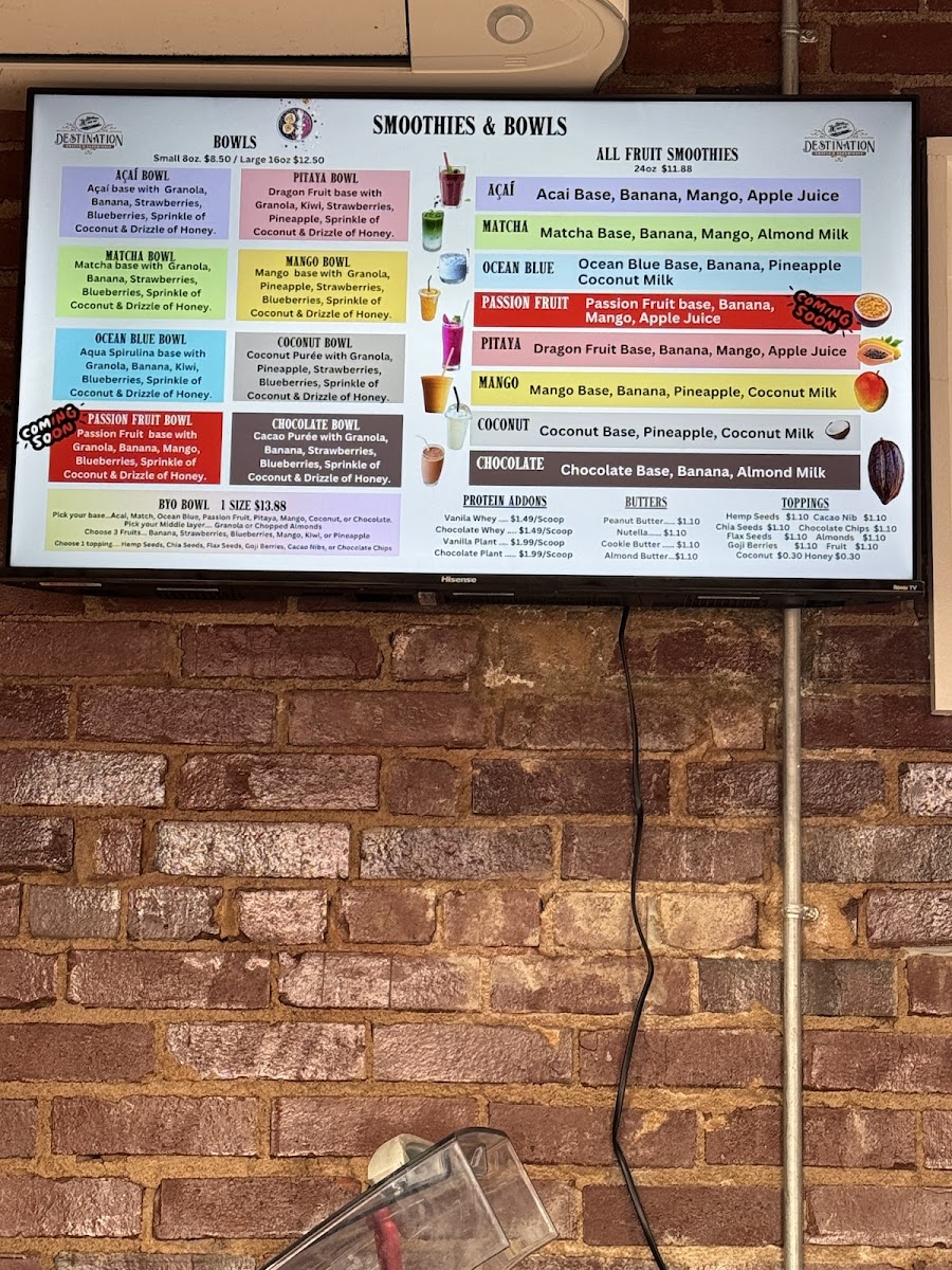BOWLS ACAI 8oz 8.50 ACAI 16oz 12.50 CHOCOLATE 8oz 8.50 CHOCOLATE 16oz 12.50 COCONUT 8oz 8.50 COCONUT 16oz 12.50 MANGO 8oz 8.50 MANGO 16oz 12.50 MATCHA 8oz 8.50 MATCHA 16oz 12.50 OCEAN BLUE 8oz 8.50 OCEAN BLUE 16oz 12.50 PASSION FRUIT 8oz 8.50 PASSION FRUIT 16oz 12.50 PITAYA 8oz 8.50 PITAYA 16oz 12.50 BYO Bowl 13.88